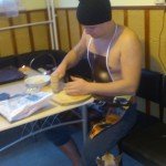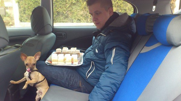 Még két említésre méltó dolgot szeretnék kiemelni a karácsonyból, az egyik, hogy tényleg nagy dicséret illeti a kis férjecskémet, mert mindhárom nap cipeltük a sütiket ide-oda, és mivel én vezettem, ő fogta, amitől alapból kimegy a haja, mert mindig övé a hálás feladat, hogy fogja a levest például, nehogy kilötyögjön… Szegény már teljesen ki volt ezen bukva, mert be lett passzírozva a kocsi hátsó ülésére, tálca sütemény a kezébe, kutya mellette, én meg rallyztam 🙂 Végül persze, hogy rajta landoltak a sütemények, a kutya meg egyből neki esett és nyalogatta a tejszínhabot a kabátjáról. Én annyira röhögtem…. 🙂 🙂 🙂 És nem hogy segítettem volna, egyből a telefont kaptam elő, hogy ezt megörökítsem.
