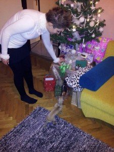 Igaziból nem szeretek meglepetést kapni, mert nem nagyon tudják eltalálni, mit szeretnék, és ha meg olyat kap az ember ami nem tetszik neki, kínos azt megmondani, eljátszani, hogy tetszik, azt meg még kínosabb… Ezért jobb megmondani, mit szeretne az ember 🙂 Én idén csak néhány ruhát kértem, mert ugye nem férek már bele semelyik ruhámba. De tudtam, hogy nem fogok kapni, mert senki nem hozta fel ezt a témát, egyedül meg csak nem olyan bátrak, hogy megveszik. Álltam a fa előtt, és láttam az ajándékaimat. Fúú, jó nagy csomagok 🙂 De mi lehet az??? Mikor kibontottam az elsőt, majdnem dobtam egy hátast. Pár hónappal ezelőtt kinéztünk egy dorkót, amibe teljesen bele szerettem, de akkor nem vettük meg, és még emlékezett rá, és megvette nekem :)Jaaaaj, teljesen oda vagyok ezért a cipőért 🙂 Pluszba kaptam még egy pihe puha Szandikás fürdőköpenyt, amilyet már 2 éve szerettem volna, és már el is felejtettem. Nagyon jó kis ajándékok ezek, örülök nagyon nekik, de hát ugye ruhám attól még nincs. És akkor jött a harmadik ajándék, egy boríték (a Balázs szeint: a boríték mindig jót jelent) 🙂 és lááám egy H&M-es ajándékkártya lapult benne 🙂 Így be tudok magamnak vásárolni. Szóval szipi-szupi csudi jók az idei meglepetések 🙂 Jövőre is jöhetnek!!!