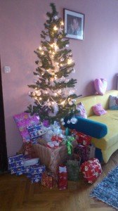 A sütés után következett a fadíszítés. Nem vagyok híve az élő fának. Egyrészt, sajnálom is őket, másrészt macera az egész, amíg felállítod, potyognak a levelek, bök, ragad, nem úgy áll, ahogy kellene… Sok bosszúságot okoz. Míg ha van egy szép műfenyő, amit úgy hajtogatsz, ahogy szeretnél, nem hullajtja a tűleveleket, stb. Mi megmaradunk a jól bevált kis fánknál. És ha megszületik a gyerek, akkor sem lesz ez másképp. Majd lát a mamánál, meg itt-ott igazi fát. A fa feldíszítésétől egy kicsit féltem, mert szerintem ez férfimunka, de nem mertem kizárólagosan a kicsi férjecskémre bízni, mert azért valljuk be, nem rendelkeznek olyan szépérzékkel, mint amivel mi nők lettünk megáldva. 🙂 Így együtt estünk neki. Hát be kell valljam, itt is pozitívan kellett csalódnom, mert nagyon ügyesen pakolta a díszeket, és kb 10 perc alatt készen lettünk a fával. 🙂
